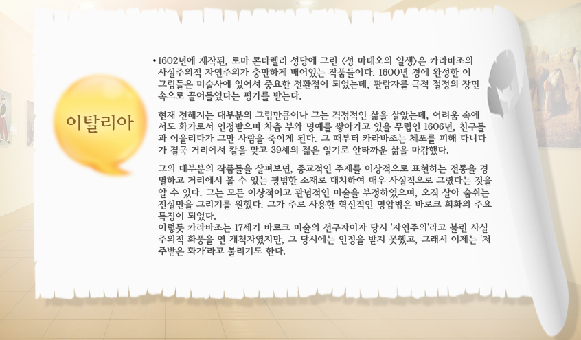 - ÀÌÅ»¸®¾Æ Ä«¶ó¹ÙÁ¶ Caravaggio(1571~1610) 1602³â¿¡ Á¦ÀÛµÈ, ·Î¸¶ ÄÜŸ·¼¸® ¼º´ç¿¡ ±×¸° '¼º ¸¶Å¿ÀÀÇ ÀÏ»ý'Àº Ä«¶ó¹ÙÁ¶ÀÇ »ç½ÇÁÖÀÇÀû ÀÚ¿¬ÁÖÀǰ¡ Ãæ¸¸ÇÏ°Ô ¹è¾îÀÖ´Â ÀÛǰµéÀÌ´Ù. 1600³â °æ¿¡ ¿Ï¼ºÇÑ ÀÌ ±×¸²µéÀº ¹Ì¼ú»ç¿¡ ÀÖ¾î¼ Áß¿äÇÑ ÀüȯÁ¡ÀÌ µÇ¾ú´Âµ¥, °ü¶÷ÀÚ¸¦ ±ØÀû ÀýÁ¤ÀÇ Àå¸é ¼ÓÀ¸·Î ²ø¾îµé¿´´Ù´Â Æò°¡¸¦ ¹Þ´Â´Ù. ÇöÀç ÀüÇØÁö´Â ´ëºÎºÐÀÇ ±×¸²¸¸ÅÀ̳ª ±×´Â °ÝÁ¤ÀûÀÎ »îÀ» »ì¾Ò´Âµ¥, ¾î·Á¿ò ¼Ó¿¡¼µµ Ȱ¡·Î¼ ÀÎÁ¤¹ÞÀ¸¸ç Â÷Ãû ºÎ¿Í ¸í¿¹¸¦ ½×¾Æ°¡°í ÀÖÀ» ¹«·ÆÀÎ 1606³â, Ä£±¸µé°ú ¾î¿ï¸®´Ù°¡ ±×¸¸ »ç¶÷À» Á×ÀÌ°Ô µÈ´Ù. ±× ¶§ºÎÅÍ Ä«¶ó¹ÙÁ¶´Â üÆ÷¸¦ ÇÇÇØ °í´ÜÇÑ µµ¸ÁÀÚÀÇ »îÀ» »ì¾Ò´Ù. 1607³â, ±â»ç ¼öµµÈ¸ ÃÑȸÀåÀÎ ¾Ë·ÎÇÁ µå ºñ³ÄÄí¸£ÀÇ ÃÊ»óȸ¦ ±×¸®¸é¼ ÀÎÁ¤¹Þ°Ô µÇ¾î ¸ôŸ ±â»ç´ÜÀÇ ±â»ç·Î Áö¸íµÇ±âµµ Çϸç, ºñ·Ï µµ¸ÁÀÚÀÇ ½ÅºÐÀ̾úÁö¸¸ ÀÌ ½Ã±â µ¿¾È ±×´Â ÈǸ¢ÇÑ ±×¸²µéÀ» ¸¹ÀÌ ³²°å´Ù. ÀÌ·¸°Ô ºÒ¾ÈÇÑ »îÀ» »ì´ø Ä«¶ó¹ÙÁ¶´Â ±äÀå°ú ÇǰïÀ¸·Î º´À» ¾ò¾î ³¡³» ȸº¹µÇÁö ¸øÇÏ°í ¸¸´Ù. ±×·¯´ø 1610³â 7¿ù 18ÀÏ, ¿¹Àü¿¡ ±×¿Í ´ÙÅ÷ ÀûÀÌ ÀÖ´Â ÇÑ ±ÍÁ·ÀÌ º¸³½ ÀÚ°´ÀÇ Ä®¿¡ Á״´Ù. ³¸¼± ÁöÁßÇØ ÇØº¯°¡¿¡¼ ¸»¶ó¸®¾Æº´À¸·Î Á×À½À» ±â´Ù·Á¾ß Çß°í, °á±¹ 39¼¼ÀÇ ÀþÀº Àϱâ·Î ¾ÈŸ±î¿î »îÀ» ¸¶°¨Çß´Ù. ±×ÀÇ ´ëºÎºÐÀÇ ÀÛǰµéÀ» »ìÆìº¸¸é, Á¾±³ÀûÀÎ ÁÖÁ¦¸¦ ÀÌ»óÀûÀ¸·Î Ç¥ÇöÇÏ´Â ÀüÅëÀ» °æ¸êÇÏ°í °Å¸®¿¡¼ º¼ ¼ö ÀÖ´Â Æò¹üÇÑ ¼ÒÀç·Î ´ëÄ¡ÇÏ¿© ¸Å¿ì »ç½ÇÀûÀ¸·Î ±×·È´Ù´Â °ÍÀ» ¾Ë ¼ö ÀÖ´Ù. ±×´Â ¸ðµç ÀÌ»óÀûÀÌ°í °ü³äÀûÀÎ ¹Ì¼úÀ» ºÎÁ¤ÇÏ¿´À¸¸ç, ¿ÀÁ÷ »ì¾Æ ¼û½¬´Â Áø½Ç¸¸À» ±×¸®±â¸¦ ¿øÇß´Ù. ±×°¡ ÁÖ·Î »ç¿ëÇÑ Çõ½ÅÀûÀÎ ¸í¾Ï¹ýÀº ¹Ù·ÎÅ© ȸÈÀÇ ÁÖ¿ä Æ¯Â¡ÀÌ µÇ¾ú´Ù. ÀÌ·¸µí Ä«¶ó¹ÙÁ¶´Â 17¼¼±â ¹Ù·ÎÅ© ¹Ì¼úÀÇ ¼±±¸ÀÚÀÌÀÚ ´ç½Ã 'ÀÚ¿¬ÁÖÀÇ'¶ó°í ºÒ¸° »ç½ÇÁÖÀÇÀû ÈdzÀ» ¿¬ °³Ã´ÀÚ¿´Áö¸¸, ±× ´ç½Ã¿¡´Â ÀÎÁ¤À» ¹ÞÁö ¸øÇß°í, ±×·¡¼ ÀÌÁ¦´Â 'ÀúÁÖ¹ÞÀº Ȱ¡'¶ó°í ºÒ¸®±âµµ ÇÑ´Ù.
